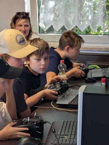 Modellflug-Simulatoren bereit. Zudem durften wir den Kindern die Vogelperspektive ermöglichen und per Race-Drohne und FPV (First-Person-View) Brille ein paar Runden über das Vereinsgelände