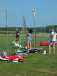 Motorsegler nebst den dazugehörigen „Lehrern“ am Sender bereit. Doch bevor es an die fliegende Materie ging, hörten sich die Kinder aufmerksam an was alles zu einem Modellflugzeug dazu gehört, wie
